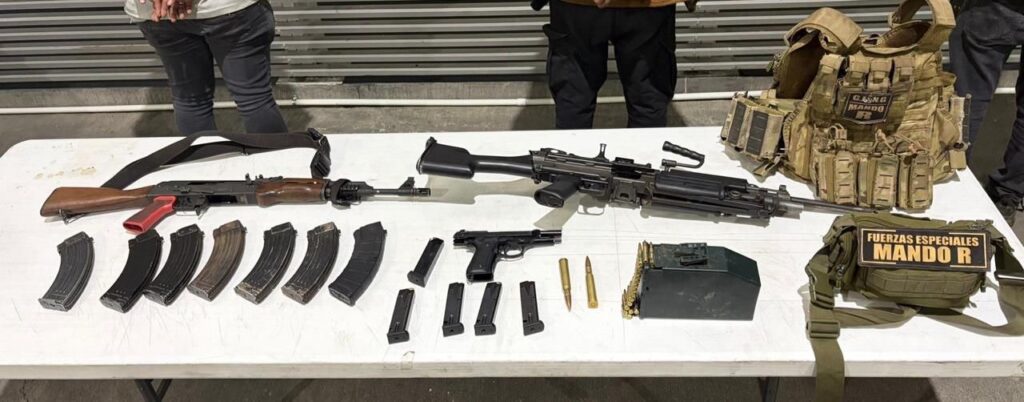 Al realizar las inspecciones correspondientes, conforme a los protocolos establecidos, los oficiales localizaron armas de fuego largas y cortas. Todas las armas aseguradas son de uso exclusivo del Ejército, entre ellas una ametralladora tipo Minimi, además de cargadores, cartuchos útiles y equipo táctico; por ello se procedió al aseguramiento de los indicios y a la detención de los tripulantes.